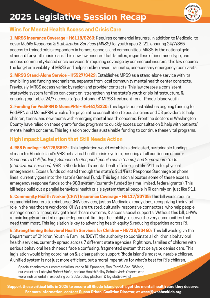 Thanks to our bill sponsors, Rep. Teresa Tanzi and Sen. Alana DiMario, families with commercial insurance will be able to access Mobile & Response Stabilization Services (MRSS) and avoid costly, unneccessary trips to the Emergency Room.  With a state behavioral health system designed for children on Medicaid and 2/3 of children and youth in Washington County with commercial insurance,  Washington County has long been underserved with countless families unable to access needed mental health services for their children. To secure needed crisis services for all children in RI, the state must think beyond time-limited federal grants and Medicaid billing.  Requiring commercial insurers to pay for crisis services is a step in the right direction. Recognizing the benefits, Blue Cross Blue Shied RI began paying for MRSS last year. Now other insurers will pay for these services as well.  Additional legislation passed making MRSS a “Stand Alone Service” to assure stable funding and access to families statewide.  Any family in crisis can request these services by contacting contacting the state’s Crisis Lifeline at 988 or contacting Family Service of RI or Tides Family Services directly.